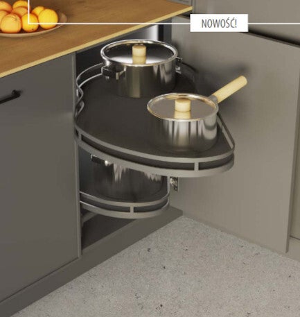 Działanie: Dwie niezależne półki o opływowym kształcie, które całkowicie wysuwają się poza obrys szafki płynnym ruchem.